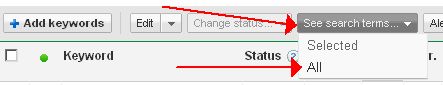 Learn how customers are finding your ad! Here, you’ll see the actual searches that triggered your ad and led to a click. These terms were matched to your ads based on the keywords you chose. To see these terms click on the “See Search Terms” button right under the keyword graph along with the same row of buttons as “Add Keywords” (see image); then click “All”. If you have enough data you will be presented with all the terms users entered into Google search that triggered your ad. This is great insight in my opinion. You are basically given an inside view into your potential customers search trends. Great stuff.