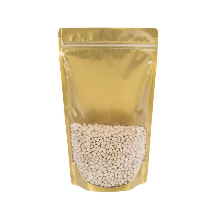 Create a dazzling display for your product in this Gold Backed Zipper Pouch Gusset Bag. Measured at 6 3/4" x 3 1/2" x 11 1/4", this bag has a usable space of 5 7/16" x 3" x 7 1/4" and holds 8-12oz/227-340g. A clear front panel provides full visibility of your product, while a gold printed interior offers an upscale look. Products like coffee, tea, cookie/cake mixes, dried fruit, and nuts are a great fit for this expanding, self-supporting pouch design. An airtight zipper provides closure and prolongs freshness. Tear notches allow for an easy opening when this pouch is heat sealed. This 3.5 mil bag is made with a moisture-proof and odor-proof barrier to keep your products fresh.
