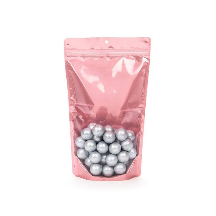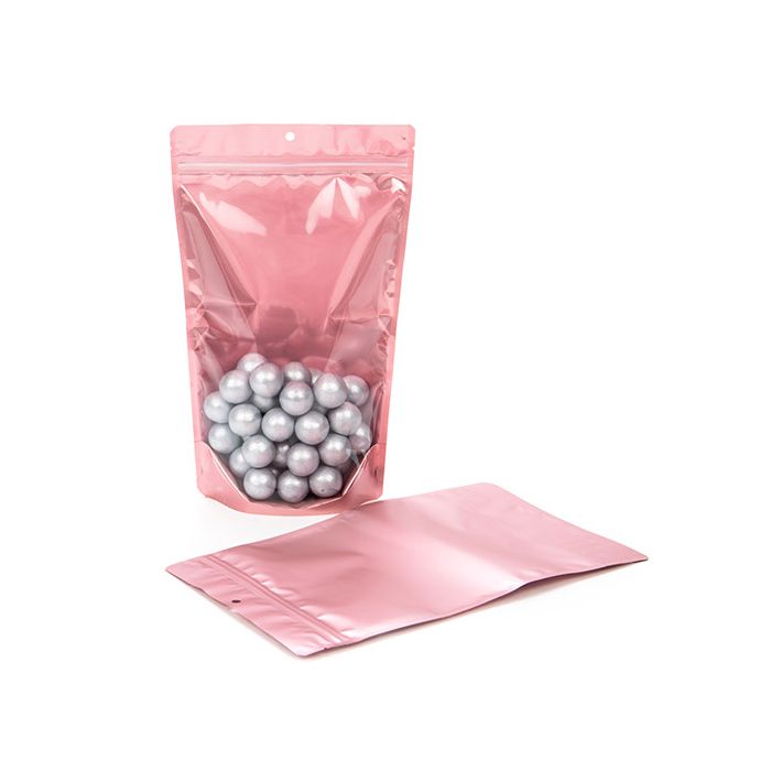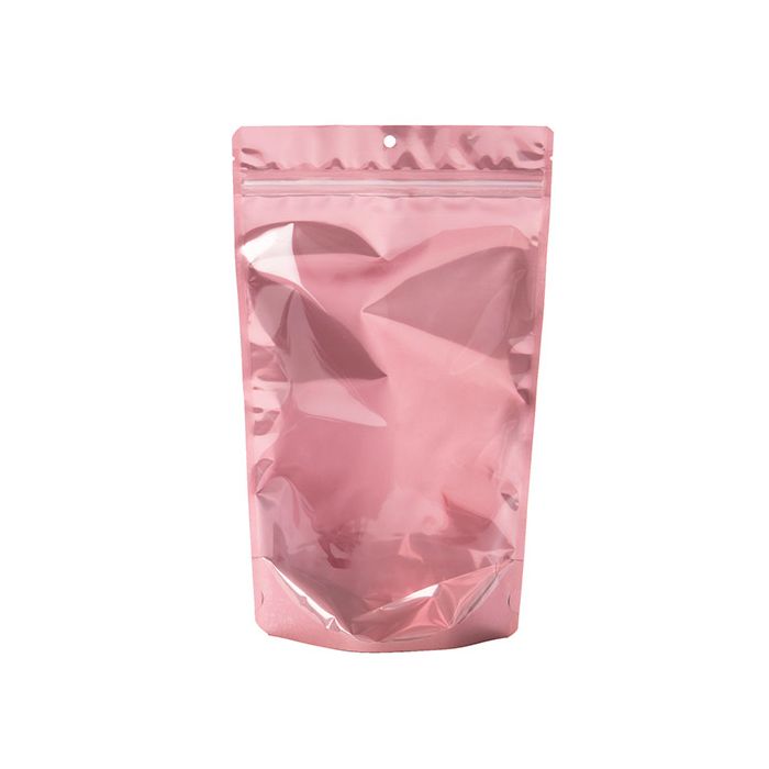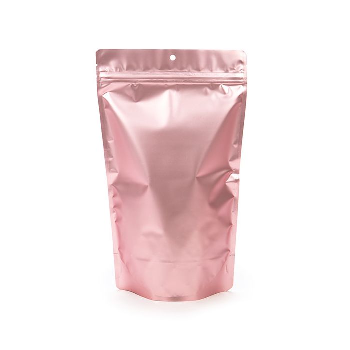 Perfect for medium-sized portions, our ZBGRG4 stand up pouch is designed in rose gold with a clear front panel. This flexible pouch measures 6 3/4" x 3 1/2" x 11 1/4" and holds 8-12 oz/227-340 g. A bottom gusset allows this pouch to stand upright on store shelves. A round hang hole is included for a retail hanging display. Tear notches and a resealable zipper offer customers convenience and easy access. Package chips, grains, pancake mix, nuts, chocolates, pet treats, and more. Pouches can be heat sealed for a more secure closure. Food Safe.