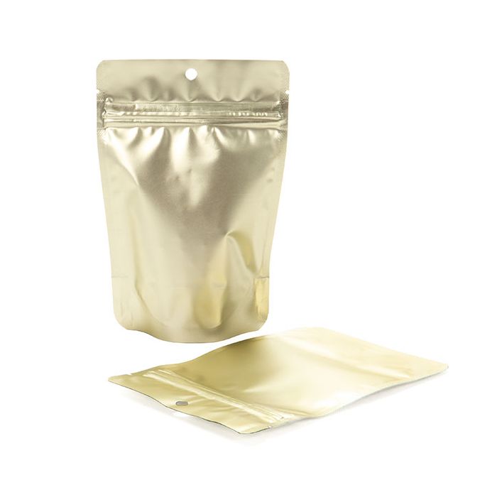 Add pizzazz to your food packaging with this stand up pouch in matte gold. Our ZBGM2MG pouch measures 4" x 2 3/8" x 6" and features a resealable zipper, tear notches, and a round hang hole. Snacks, candy, nuts, coffee, and more are perfect in this 2 oz stylish zipper pouch. Food safe and laminated for extra strength. Heat sealable.
