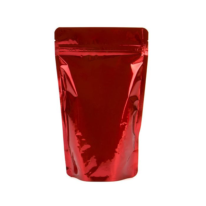 This 5 1/8" x 3 1/8" x 8 1/8" Red Metallized Zipper Pouch Bag works great for specialty products and makes a memorable impression on retail shelves. These pouches will hold 4oz/113g of dry goods or non-refrigerated items (based on whole coffee beans). Fill these pouches with jerky, trail mixes, spices, chips, bath salts, and more. Made of high metallized 4 mil material, these pouches protect product freshness and scents. A resealable zipper and tear-away notches allow for an easy opening once heat sealed. These red pouches look great with an added label or custom print design. Inner dimensions are 4 3/4" x 2 1/2" x 6 5/8".