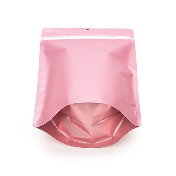 Our ZGBM4RG pouch features a dusty pink color with a metallic tint for a fresh look on store shelves. This stand up zipper pouch measures 6 3/4" x 3 1/2" x 11 1/4" and holds 8-12 oz (227-340 grams) of bulk candy, chips, rice, uncooked pasta, birdseed, and more. A smell-proof and moisture-proof barrier ensures product freshness. Tear notches and a resealable zipper provide easy access to your product. A round hang hole works great for a hanging retail display. For a secure closure, these pouches are heat sealable.
