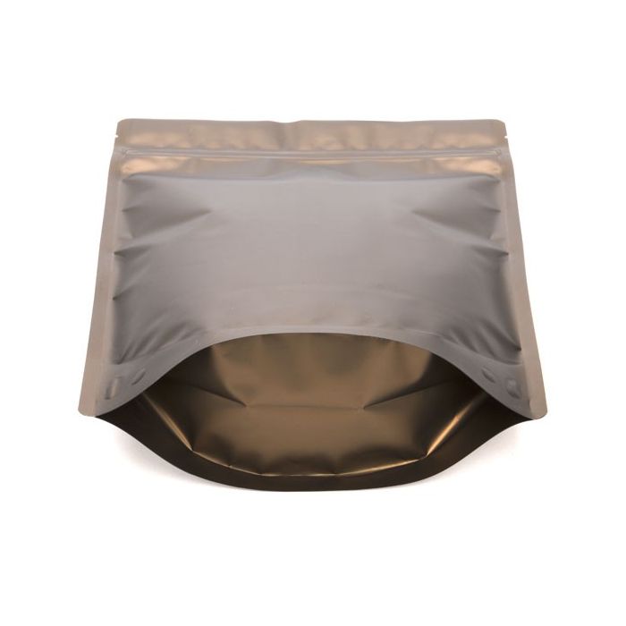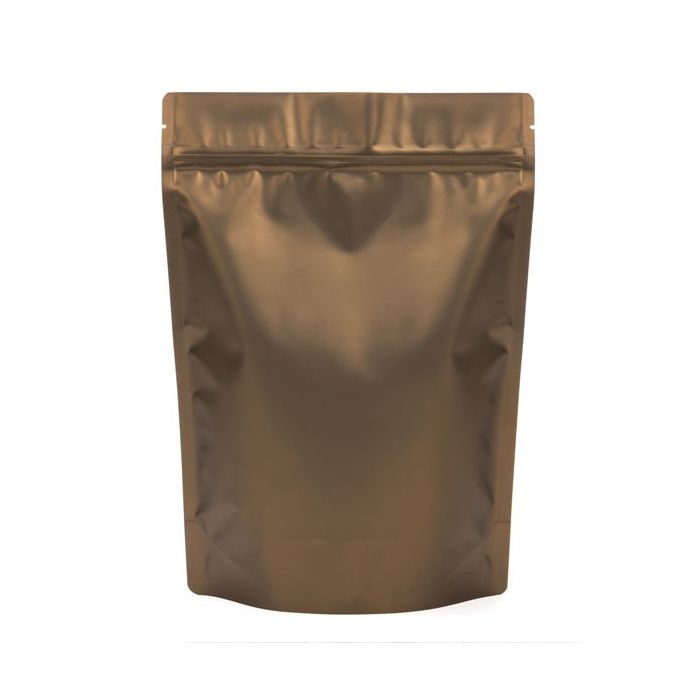 Give your products a classy look with our matte bronze metallized zipper pouch. ZBGM5BZ measures 8 1/4" x 3 1/2" x 11 1/2" and holds 14-18 oz (397-510 g). Fill this pouch with granola, baked goods, powdered mixes, pet treats, and more. Made with laminated material for added strength and barrier, this 5 mil pouch locks in freshness and flavors. Tear notches and an airtight, resealable zipper offer customers convenience and easy snacking. A bottom gusset allows this pouch to stand upright on store shelves so your product gets noticed. Ample space is provided on this matte bronze finish for labeling and branding.