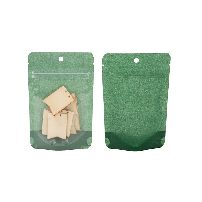 The refreshing look of this stand up rice paper pouch in harvest green is sure to be a crowd-pleaser. Our ZBGR2HG pouch measures 4" x 2 3/8" x 6" and holds 2 oz/57 g of dry goods. The front of the pouch is clear to showcase candy, tea, mints, bath salts, and more. Includes a resealable and convenient tear-away notches. Heat sealable.