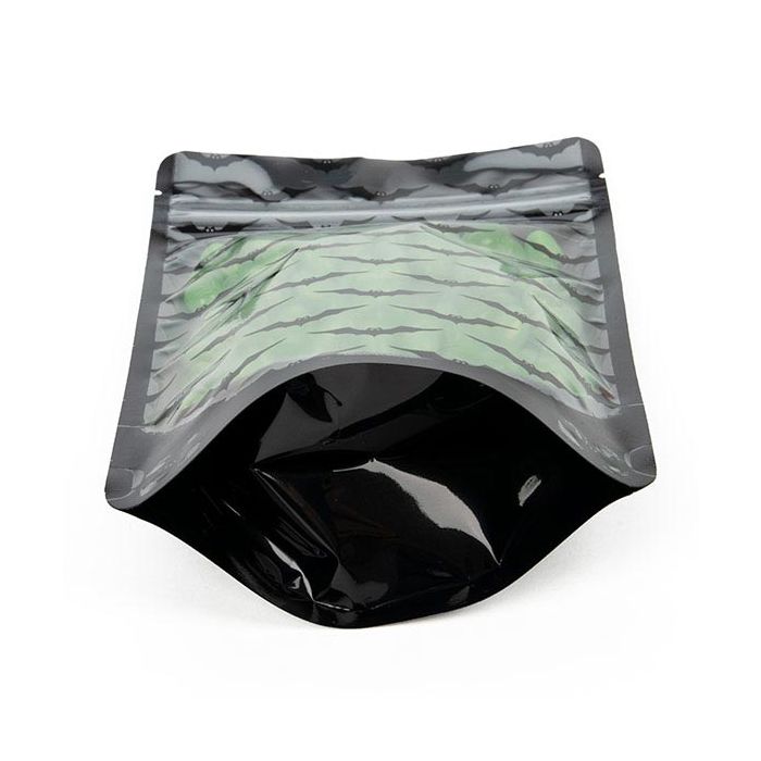 What says Halloween more than black bats? This seasonal pouch features black bats pre-printed onto the clear front panel, allowing the goodies inside to be seen. The solid, opaque black back of the bag allows for branding, labels and more. Measuring 5 1/8" x 3 1/8" x 8 1/8", this food safe pouch can hold 4oz/113g of dried goods (based on whole coffee beans). The usable space measures 4 3/4" x 2 1/2" x 6 5/8". The airtight zipper will help keep your products fresh. Bag can be heat sealed closed and features tear notches for customers to easily open after purchase. Bag stands up on its own on store shelves.