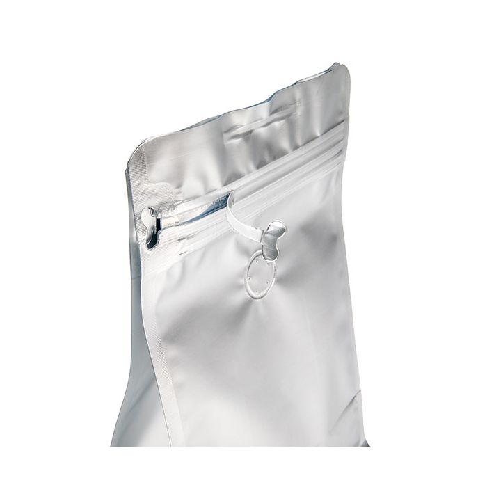 BBC2S is a Box Bottom Coffee Bag that has a silver finish. It measures 5" x 3 1/8" x 8" and holds up to 16 oz of coffee beans. The four seal design allows this product to stand up right for great shelf presence. The top comes open for easy loading and then can be heat sealed closed to become tamper resistant. On the front of the coffee bag is a pocket zipper that stays securely closed until the tear strip is removed. This bag is made from 5 mil high barrier, food safe materials to lock in freshness. A degassing valve ensures the product stays fresh. The opaque silver finish provides ample space for branding.
