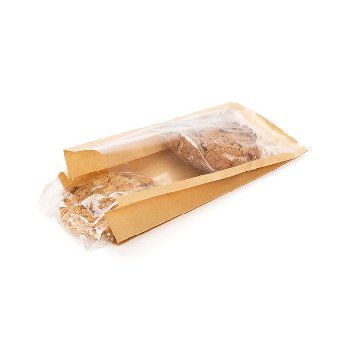 Kraft side gussets bags are ideal for baked goods and deli items. Our KSG3 bag measures 4" x 2 1/8" x 8" and is designed with a clear paneled window that runs the full length of the package. The full panel window offers an enticing presentation of cookies, brownies, cake pops, rolls, breadsticks, and more. This bag features a grease-resistant inner lining, making it a perfect fit for baked goods. Side gussets create extra space for bulky items, making it easy to load and unload your treats. Customers get a scrumptious view of their goodies placed inside this bag. Great for takeaway treats or for a store display. This bag is heat sealable and food safe.