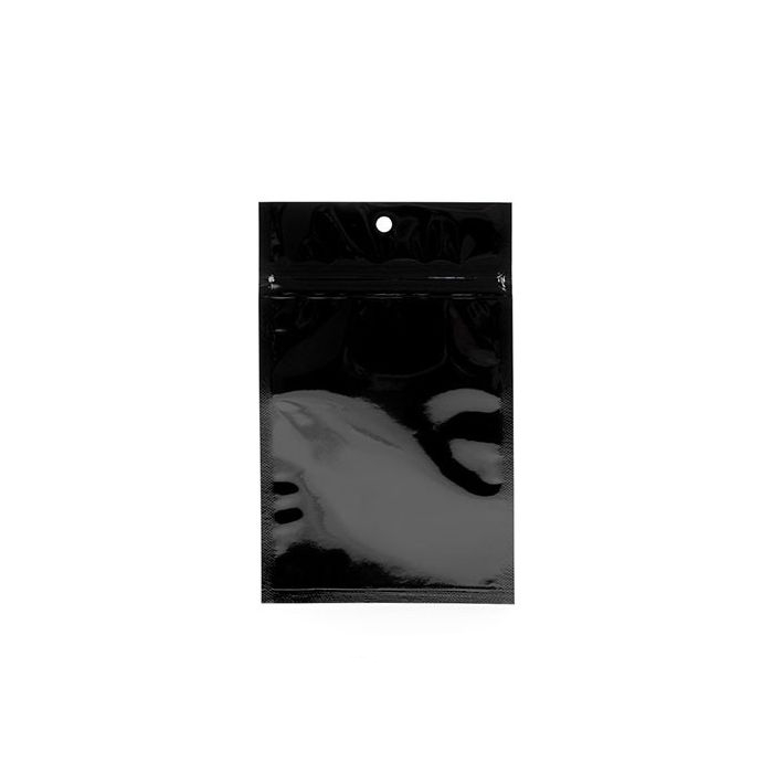 Tamper Resistant packaging will keep your products safe from curious children. Hanging Zipper Bags are easy to fill, seal, and display. Made of a black metallized material, these high barrier bags feature strong side seams, pre-opened zippers, a round hang hole, and come without tear notches. Inner Dimensions: 3 5/8" x 5".