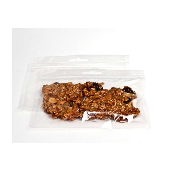 Hanging zip top barrier bags are ideal for sealing in scents and flavors. HZB64 measures 6" x 4" and is a great choice for packaging granola, candy, nuts, and more. This zippered bag is ready for retail and is sealed on three sides for extra strength. The material is 2.64 mil thick and is made of sturdy PET/CPP plastic for a durable hanging display.