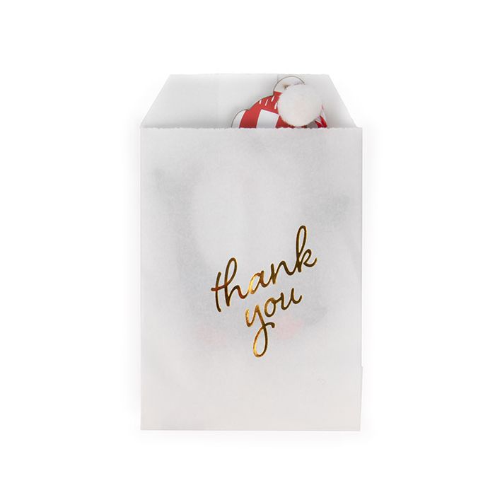Whether you are hosting a party or selling your product at a store, paper treat bags are an easy and inexpensive way to package up a treat. GPB35GT measures 3" x 5" and is made from food safe 40 gsm white paper. The front of the bag has been hot stamped in gold to read “Thank You" in cursive font. These little goodie bags are great for baked goods, candy, homemade gifts, gift cards, and more. The bags come open ended for easy filling and can either be left open or folded over. There is a 3/4" flap at the top of the bag that can be closed using a sticker or piece of tape (sold separately).