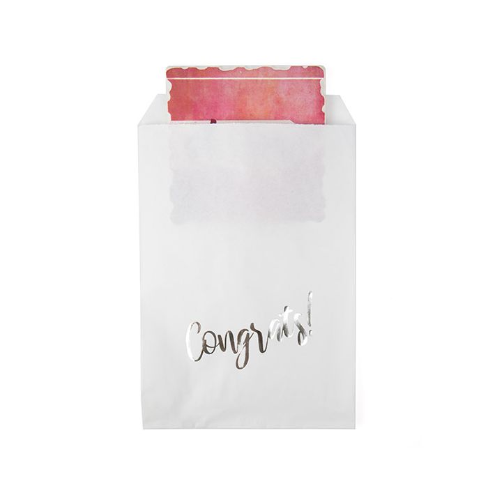 Treat Bags are perfect to use as a goodie bag or a gift favor. GPB58SC measures 5" x 8" and is made from 40 gsm white kraft material. The word “Congrats!" is hot stamped onto the front of the bag in cursive silver metallic foil. Paper treat bags are flat and come open ended for easy loading. To secure items inside, you can fold over the top of the bag and place a sticker, piece of tape, or label onto the bag (sold separately). Treat bags feature a 3/4" flap and a back center seam. They are great for cookies, candy, gifts, crafts, and more. Food safe.
