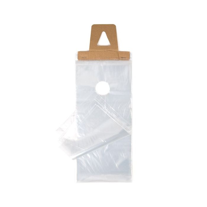 Our DK3 plastic door knob bags work great when you want to hang materials that don't have their own holes. Simply slide your coupons, flyers, and business swag into these easy-to-tear perforated bags. They measure 6" x 12" and have 6" x 9" of usable space with a 3-inch space from the bottom of the hole to the top of the bag. These 1.0 mil clear bags are bundled and attached to a cardboard hanger. Bags open at the hole of the bag and can hang as you load.