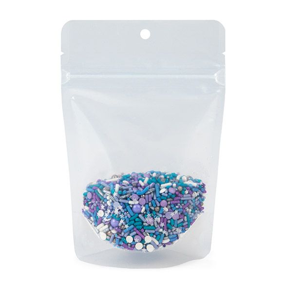 Clear Recyclable Stand Up Pouches w/ RETAIN™ are made from a 4.0 mil PE material that features a high barrier EVOH coating. This coating is approved by the SPC (Sustainable Packaging Coalition) and will not contaminate the recycling process, they are recycle/ready. ZBGERR2 measures 4" x 2 3/8" x 6" and can hold 2oz of dry goods like nuts, candy, chocolates, protein mixes, and more. They are 4.0 mil thick and feature a resealable zipper, tear notches, and a round hang hole. Pouches are designed to stand on their own once filled and can be heat sealed for a tamper resistant closure. Custom printing is available.