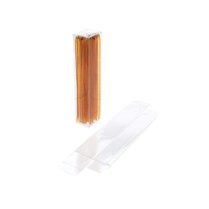 Clear soft folding boxes are a great way to add sparkle to any product display. Our FPB341 box measures 1 1/2" x 1 1/4" x 6 3/4" and works great for showcasing tall and lean products. This box is ideal for items like honey sticks, beauty products, art supplies, candy sticks, and more. For exceptional durability and clarity, this box is made from 12 mil PET material. Assembly is a snap. Simply shape boxes along soft fold lines and secure with interlocking tabs. Clear stickers are provided for a tamper-resistant closure, ideal for the retail environment or for shipping items.