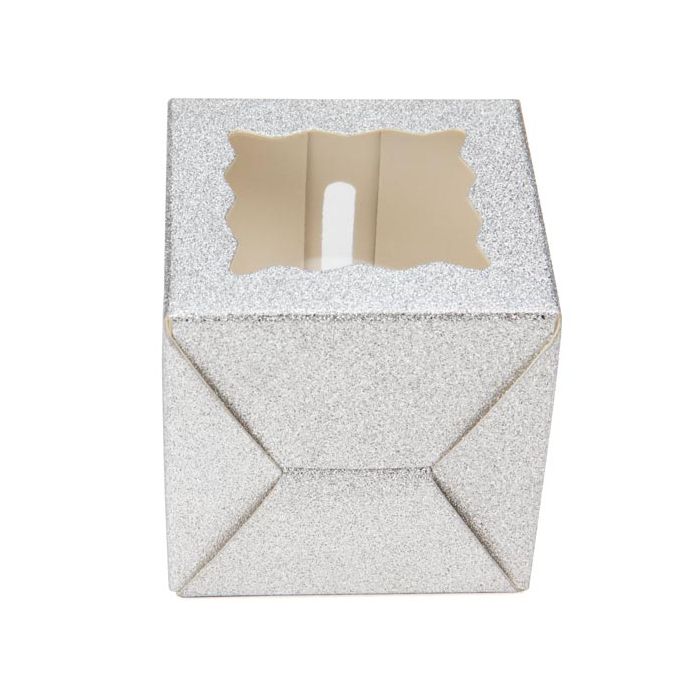 FB1SGW is our 2" x 2" x 2" silver glitter box that features a three sided crystal clear window. This two inch box is great for packaging items like mini cupcakes, candy, chocolates, macarons, and more. It is great to use for a table setting, wedding favor, or gift packaging. The silver exterior is sparkly while the scalloped windows allow the contents inside to be seen. A pre-cut hole at the top allows an opening for a lollipop stick. It is made from food safe materials with a white paper interior. Boxes ship and store flat.