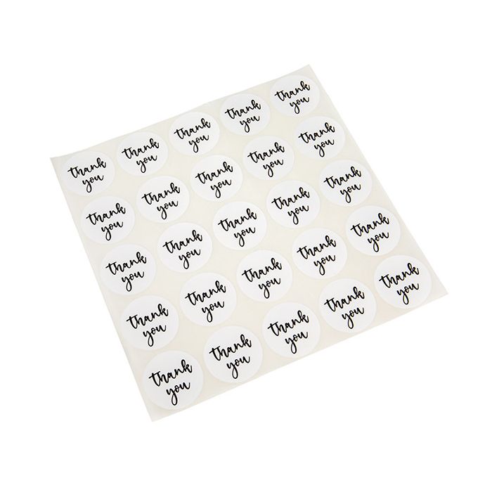 Printed labels are an easy and quick way to turn a plain item into a custom product. Whether you are placing a label on a merchandise bag to seal it, including it on an invoice, securing a thank you card, or placing on a party favor, these labels have endless possibilities. LS1HWTY are 1 1/2" round labels that are white with black text. The words “Thank You" are in a cursive font. Labels have a matte finish and feature permanent adhesive. They will stick to bags, boxes, envelopes, and more. Each sheet includes 25 labels.