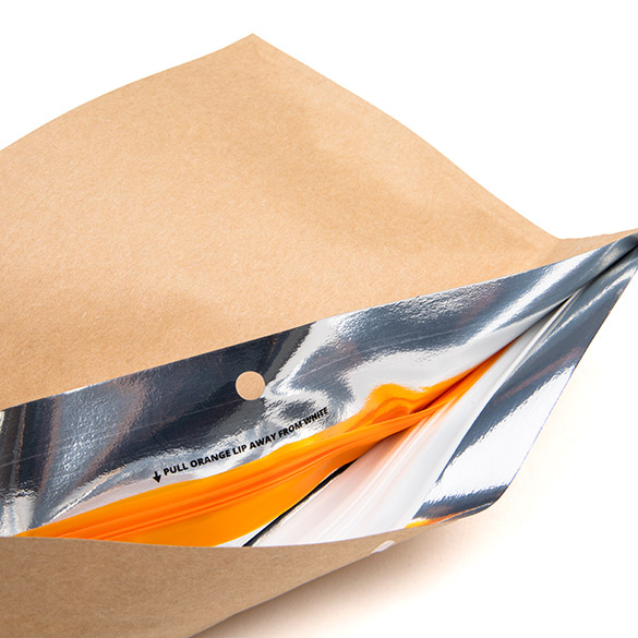CRP96K measures 9" x 2 7/16" x 6" and is an excellent packaging choice for items like laundry pods, edibles, pharmaceuticals, herbal supplements, and other adult use items. This kraft pouch is made from 5 mil food safe materials and provides a high moisture and odor barrier to keep contents fresh and discreet. The special child resistant zipper requires two hands to open and has pre-printed instructions on the inside of the flap. Once contents are placed inside the exit bag, it can be heat sealed using a standard hand sealer for an extra level of protection. Pouches are designed to stand on their own, but if shelf space is limited, a round hang hole located at the top of the bag, will allow it to hang on a 1/4" peg. Custom printing is available.