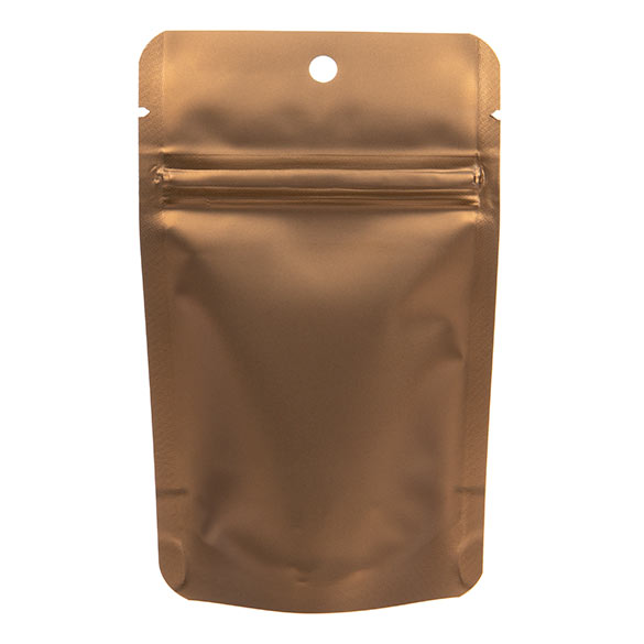 Metallized zipper pouches keep products fresh and offer an attractive display. ZBGM1BZH is our matte bronze metallized zipper pouch and is ideal for dry goods. The outer dimensions measure 3 1/8" x 2" x 5 1/8" with inner dimensions of 2 11/16" x 1 3/4" x 3 5/8". This pouch holds 1oz/28g of products like tea, candy, toffee, jerky, nuts, and coffee. Constructed with a unique high barrier, this 5 mil pouch is made of a layered blend of laminated materials to keep your products fresh in the retail space. Features include tear notches, an airtight zipper, and an attractive matte bronze finish. This pouch is heat sealable for a secure closure. Food Safe.