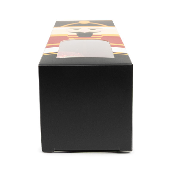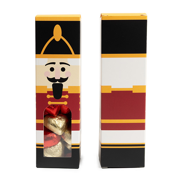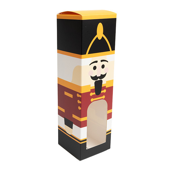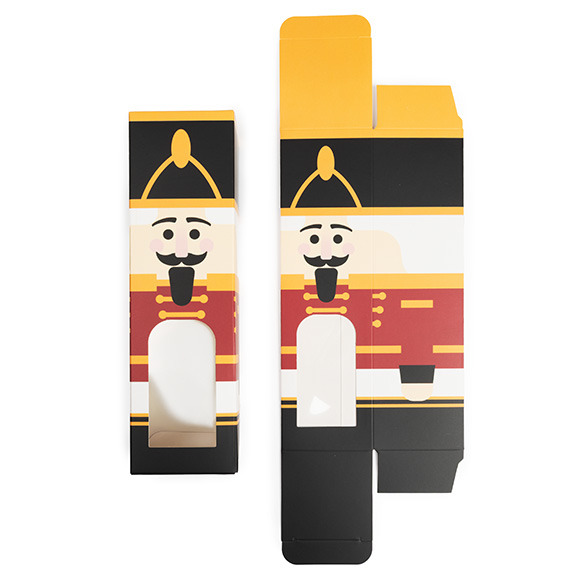 Add a touch of festive fun with Nutcracker Paper Boxes with Windows. SKB228N measures 2 1/4" x 2 1/4" x 8" and can hold delicious baked goods, candy, crafts, jewelry, and more. Made of food safe, 300gsm paper materials, these boxes feature a clear PET window for a sneak peek into the box’s contents. This unique paper box comes with a printed Nutcracker design- complete with a hat and coat! For easy shipping and storage, these boxes arrive flat. To assemble, simply fold along the soft fold lines and tuck in the tabs to close. These boxes are sure to bring some holiday cheer to any gift, boutique, bakery, party, or any other occasion.